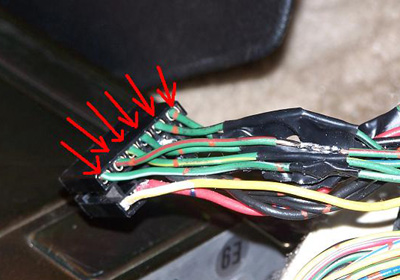 Disconnect the battery and remove the ECU from the passenger side kick-panel and remove the connectors. Pins 101-106 lead to the injector wires; you need to solder resistors in line on each one of these wires. The bottom connector (as the ECU sits in the car) contains pins 101-106 on the end of the connector opposite the locking tab. Notice the wires here, they are green in my harness (and most likely yours also).