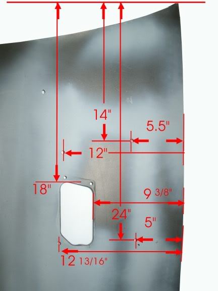 It is best if you remove the hood from the car. Place the hood on two saw horses or a suitable stable surface. Measure across the top of the hood starting the tape 5.5 inches below the corner. When the tape is extended to the opposite side, the mid point should fall right on the trailing edge of the hood which would be closest to the windshield. The hood should measure 52 7/8" wide.