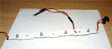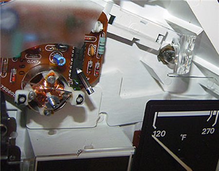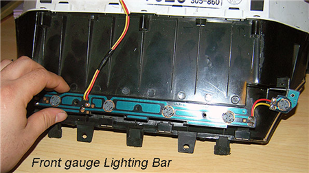 - Carefully pull off the 3 PCB’s (Lighting Bar and Auxiliary bulbs). The image shows the set up used for the lighting of the needles and Temperature/Fuel Gauges.