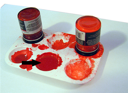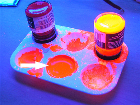- The Fluorescent Red is more like an Orange/Red; this paint will glow under true black light. I didn’t quite like the thought having bright orange needles so what I did is I went back to the hobby store and bought their Model Masters Insignia Red, which is a flat paint. I also have a paint mix tray. I experimented under the black light until I got a mix where I still had glow from the Fluorescent paint but yet it darkened some.